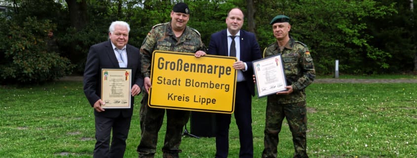 Während eines feierlichen Appells haben der Blomberger Ortsteil Großenmarpe und die Betreuungsstelle für zivilberufliche Weiterbildung der Bundeswehr in Augustdorf ihre Patenschaft offiziell besiegelt. Bürgermeister Christoph Dolle und Ortsvorsteher Peter Siegmann überreichten den Vertretern der Betreuungskompanie symbolisch ein Ortseingangsschild. Im Gegenzug übergaben Kompaniechef Martin Waltemathe und Kompaniefeldwebel René Kalze die offiziellen Patenschaftsurkunden, die zukünftig im Blomberger Rathaus, im Vereinshaus des Schützenvereins Großenmarpe-Erdbruch sowie im Kompaniegebäude in der Kaserne ihren Platz finden werden. Über 170 Gäste waren zum Startschuss für die Kooperation mit der Kompanie aus Augustdorf gekommen. Die Bundeswehr hatte für die Vereine und interessierte Bürgerinnen und Bürger aus Großenmarpe eigens einen Pendelbusverkehr eingerichtet. Gemeinsam mit den Soldatinnen und Soldaten der Bundeswehr nahmen eine Abordnung des Schützenvereins sowie des Löschzuges der freiwilligen Feuerwehr aus Großenmarpe an dem Appell zur Patenschaftsübernahme teil. Hauptmann Martin Waltemathe, Chef der Augustdorfer Patenkompanie betonte in seiner Ansprache die Bedeutung der patenschaftlichen Verbindung mit der Bevölkerung in Großenmarpe. „An einem Tag wie heute wird den Soldatinnen und Soldaten bewusst, wofür und vor allem für wen wir tagtäglich unseren Dienst verrichten“, so der Offizier. Waltemathe appellierte an die Einwohner der Patengemeinde, die Truppe als Mitglieder der Gesellschaft zu betrachten. „Letztlich unterscheiden wir uns nur in unserer beruflichen Profession von Ihnen.“ Bürgermeister Christoph Dolle bezeichnete die Patenschaftsübernahme „als besonderen Tag“ für die Stadt Blomberg, die bis dato noch keine so intensive Kooperation mit der Bundeswehr erlebt hat. Dolle bedankte sich ausdrücklich für die breite Unterstützung im Stadtrat, der Verwaltung sowie in der Bevölkerung für die Partnerschaft mit der Augustdorfer Kompanie. Für eine handfeste Überraschung sorgte beim anschließenden Sommerfest Ortsvorsteher Peter Siegmann, der in Flecktarn-Uniform ein Grußwort an die Gäste in der Rommel-Kaserne richtete. Die Marpetaler Blaskapelle spielte zum Auftakt des Sommerfestes im Garten der Gemeinsamen Heimgesellschaft, das bis in die Abendstunden andauerte und einen gelungenen Auftakt für die Patenschaft zwischen der Ortschaft Großenmarpe und der Augustdorfer Betreuungskompanie bildete. Am 25. Mai werden die Soldatinnen und Soldaten dann in der Patengemeinde zu Gast sein, wenn der Sportverein zum „Spiel ohne Grenzen“ auf den Rasensportplatz einlädt. Auch zum Schützenfest im Juni ist die Bundeswehreinheit bereits eingeladen. Zukünftig gehört die Truppe in Flecktarn in Großenmarpe selbstverständlich dazu.
