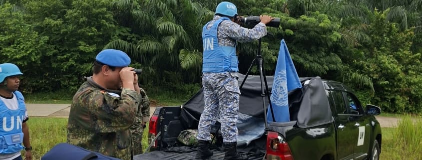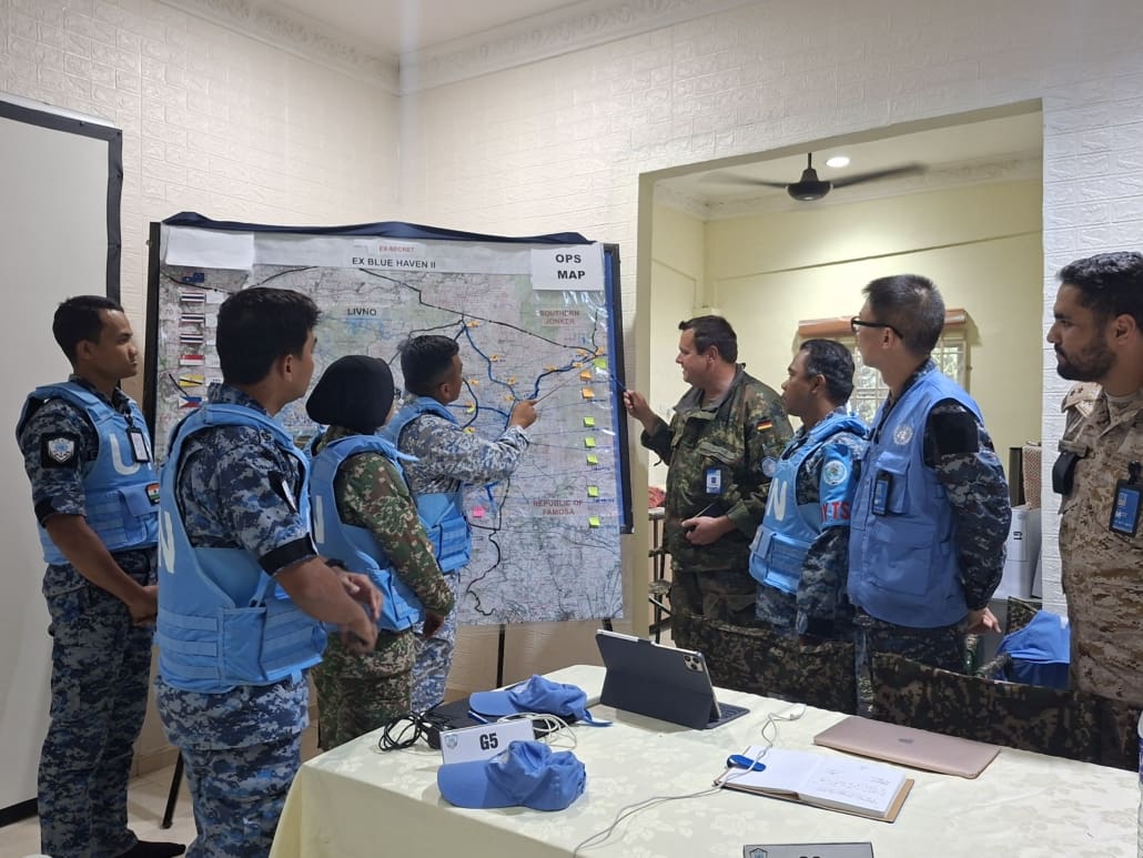 Die Luft steht schwer über dem malaysischen Dschungel. 33 Grad, 98 Prozent Luftfeuchtigkeit, Mückenschwärme im Morgengrauen – Schweiß läuft in Strömen. Zwischen dicht bewachsenen Baumreihen bewegt sich eine kleine Patrouille aus sieben blauuniformierten UN-Soldatinnen und Soldaten vorsichtig durch das Gelände. Unauffällig folgen drei Ausbilder. Einer von ihnen: Oberstleutnant Stefan aus der Panzerbrigade 21 „Lipperland“. Gemeinsam mit zwei Ausbildern des Malaysian Peacekeeping Centre begleitet er die Gruppe während einer realitätsnahen Abschlussübung in der Region Malakka.