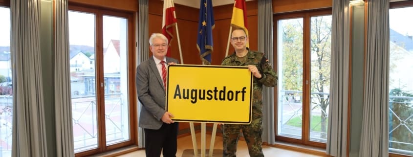 Die feierliche Übergabe des Ortsschilds fand am vergangenen Freitag im Rathaus der Gemeinde Augustdorf statt. Bürgermeister Thomas Katzer persönlich überreichte das Schild an den Kommandeur der Panzerbrigade 21 „Lipperland“, Oberst Marco Eggert. „Ich freue mich, dass die Gemeinde Augustdorf die Übergabe des Ortschildes an Einsatzverbände als Tradition fortführt, zeigt dies doch die Wertschätzung sowie die gegenseitige Verbundenheit unserer Soldaten und Soldatinnen mit ihrer Garnison.“ erklärte Oberst Eggert.