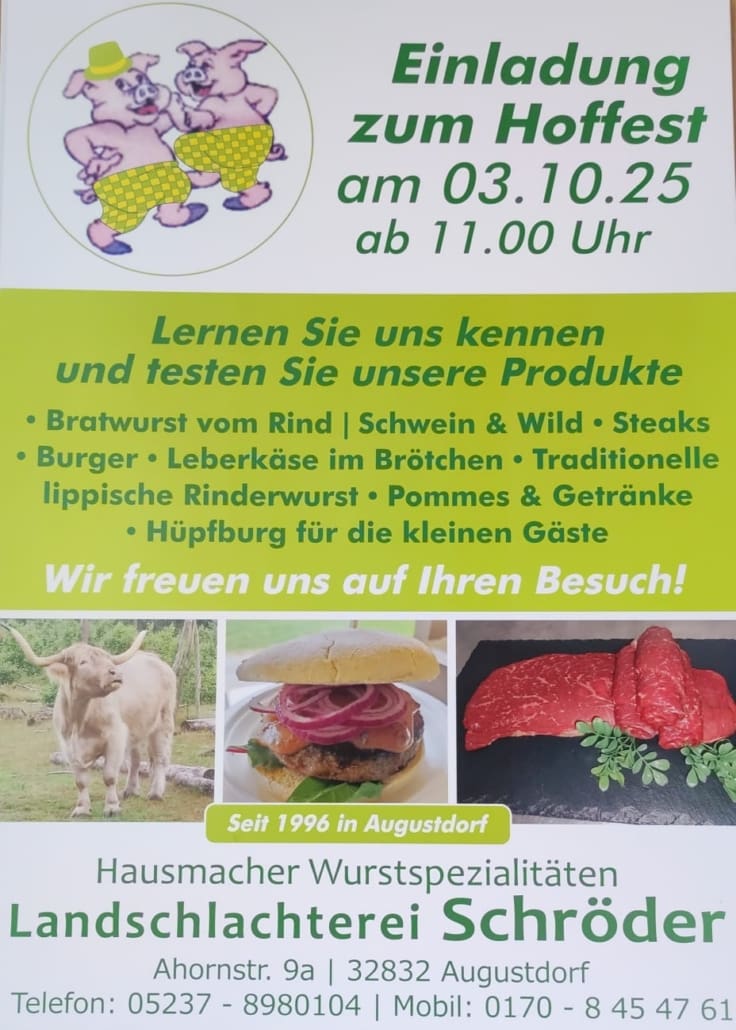Die Landschlachterei Schröder öffnet die Tore zum großen Hoffest und lädt alle Augustdorferinnen, Augustdorfer und Gäste herzlich ein.
