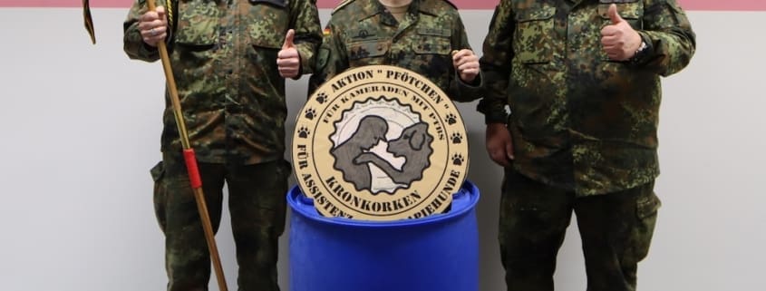 Speziell ausgebildete Therapie- oder Assistenzhunde sind daher eine unverzichtbare Stütze für einsatzgeschädigte Soldatinnen und Soldaten auf dem Weg in Richtung Normalität. Die Ausbildung der Hunde kann bis zu 25.000 Euro kosten, die oftmals durch die Betroffenen zu tragen sind. Die „Aktion Pfötchen“ unterstützt daher seit fast fünf Jahren Einsatzgeschädigte bei der Finanzierung der Helfer auf vier Pfoten. Initiator Alexander Schmidt weiß als Betroffener um den großen Wert eines Assistenzhundes.