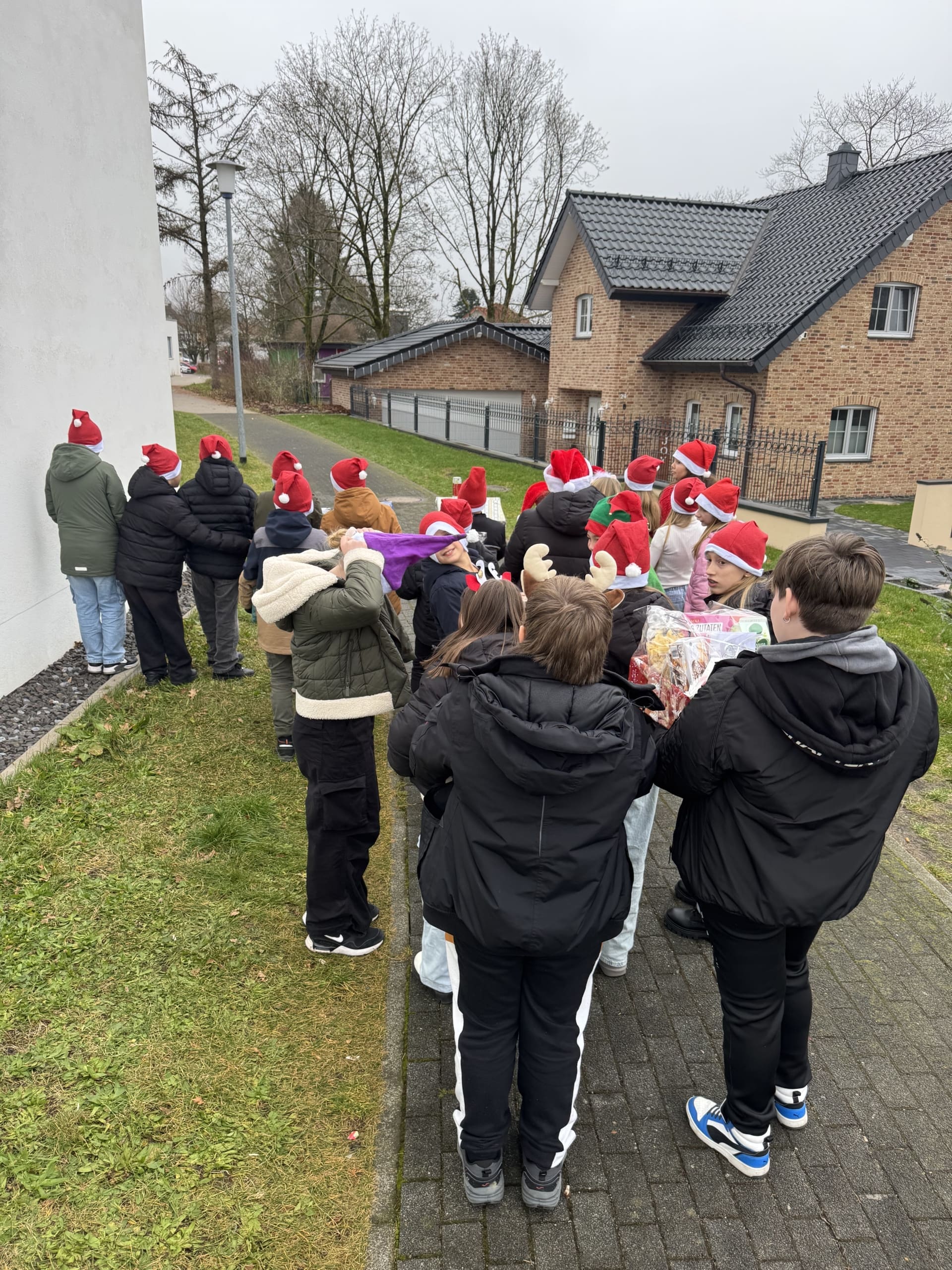 Am Mittwoch machte sich die Klasse 5c, begleitet von ihrer Klassenlehrerin Frau Kemeny, auf den Weg zum DRK, um die Pakete persönlich zu überreichen. Mit Nikolausmützen auf dem Kopf und fröhlichen Weihnachtsliedern sorgten die Schülerinnen und Schüler für eine besonders festliche Stimmung. Die liebevoll gepackten Pakete wurden dankbar entgegengenommen.